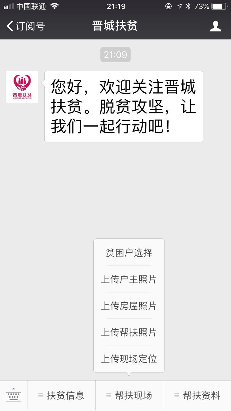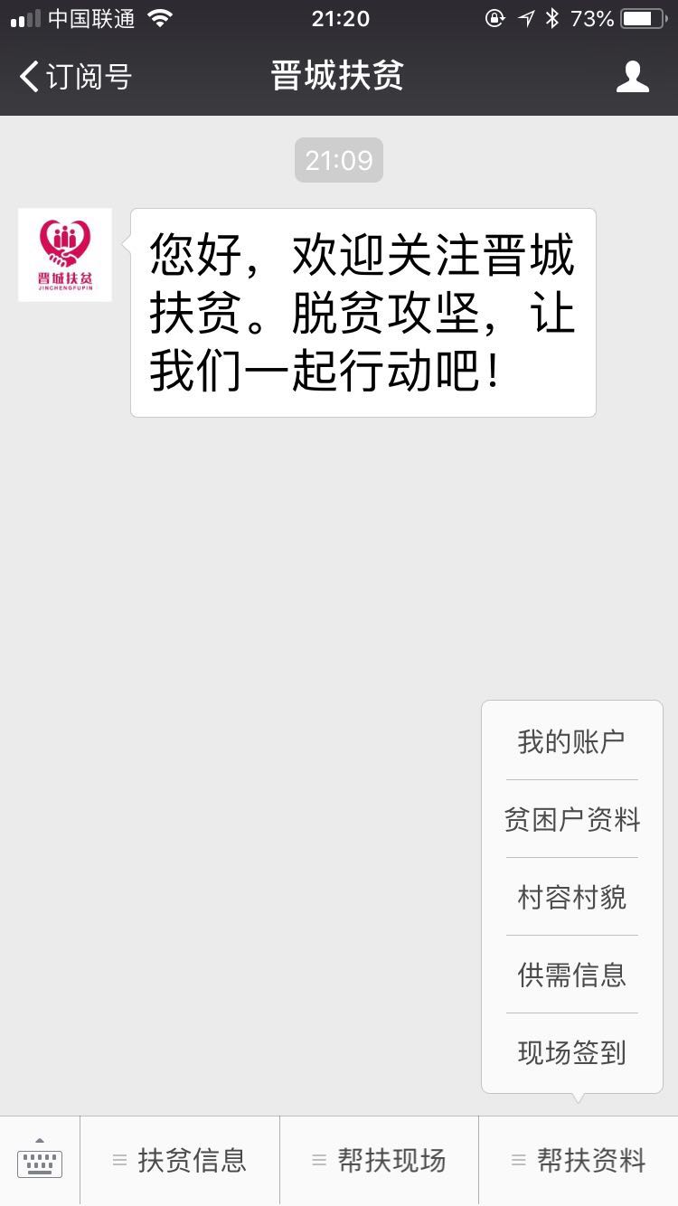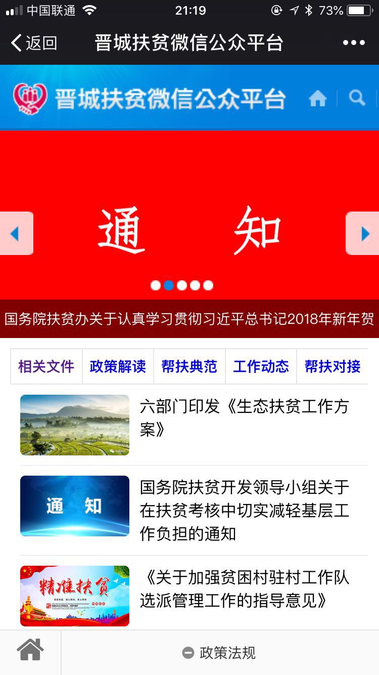 “晉城扶貧”微信公眾號定位于扶貧公益宣傳、辦公平臺、服務(wù)指南三個方面的作用,努力服務(wù)機關(guān)、社會和群眾。微信公眾號將全面宣傳中央、省、市關(guān)于扶貧方針政策和決策部署,全面反映各級領(lǐng)導、相關(guān)部門、社會各界、基層群眾的扶貧工作動態(tài),及時發(fā)布政策解讀、通知公告、辦事指南等內(nèi)容。